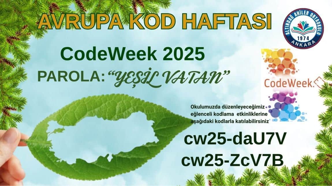 Ahiler Ortaokulu olarak bu yıl 11-26 Ekim 2025 tarihleri arasında gerçekleştirilecek olan Avrupa Code Week (Kodlama Haftası) kapsamında "Parola: Yeşil Vatan" temasıyla düzenlenen etkinliğimiz, öğrencilerimize hem dijital beceri kazandırma hem de sürdürülebilir çevre bilinci kazanmalarını ve yaratıcılığa teşvik etme yolunda kodlama yapıyoruz. Okulumuzda Bilişim öğretmenimiz rehberliğinde yürütülecek olan bu etkinlikte öğrencilerimizin doğa sevgisi ve çevre koruma duyarlılığı geliştirmeleri, ormanlarımızın ve doğal kaynaklarımızın korunmasına yönelik farkındalık kazanmaları ve sürdürülebilir bir yaşam için doğanın eşsiz önemini kavramaları amaçlanıyor.